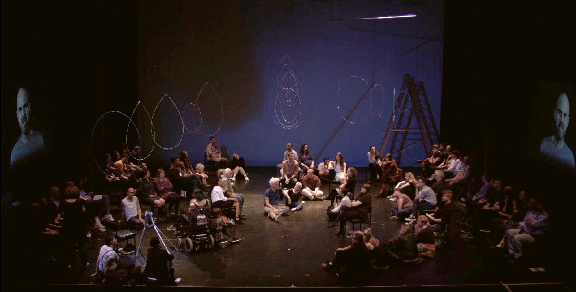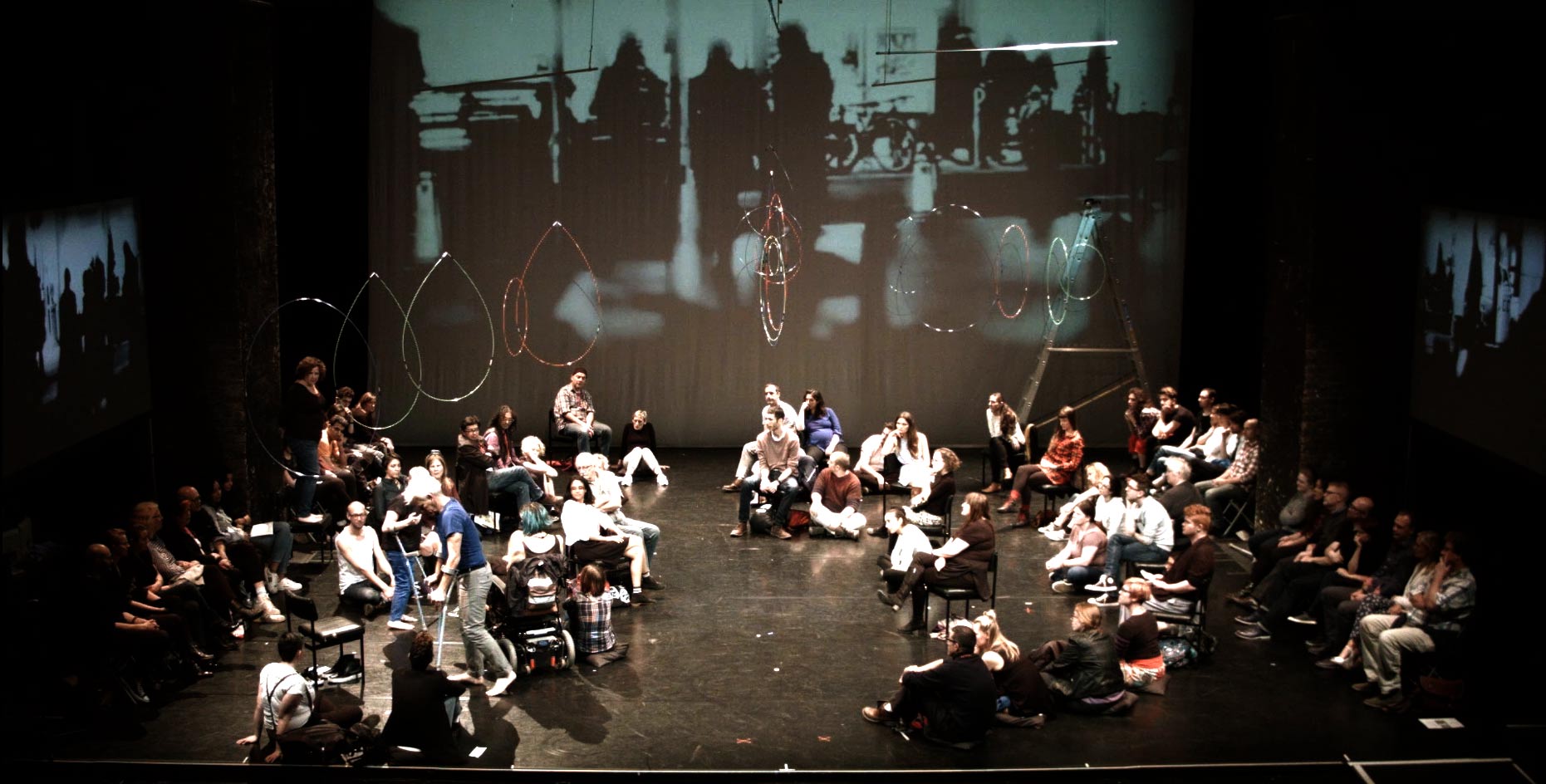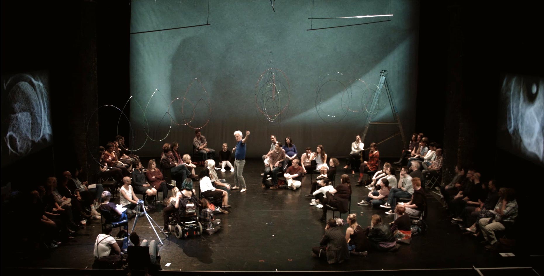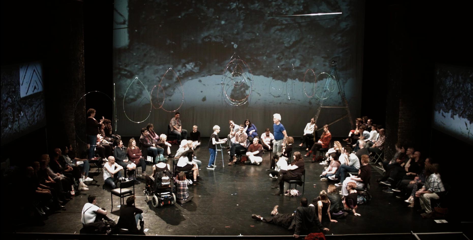 The Way You Look (At Me) Tonight is a social sculpture—a sensory journey, for two performers and audience. Dancing, singing, telling stories and asking questions, leading UK disabled artist Claire Cunningham and international choreographer and performer Jess Curtis, combine performance, original music, and video to wrestle (sometimes literally) with important questions about our habits and practices of perceiving each other and the world.