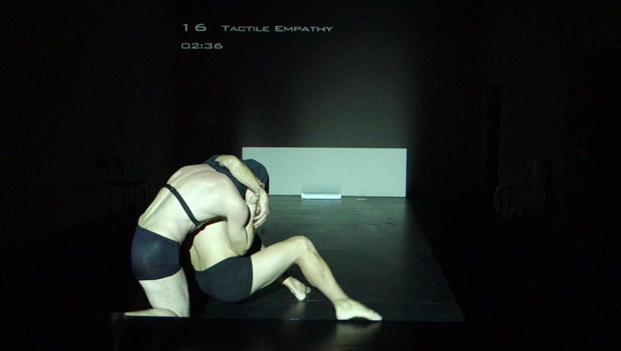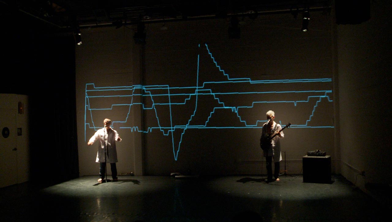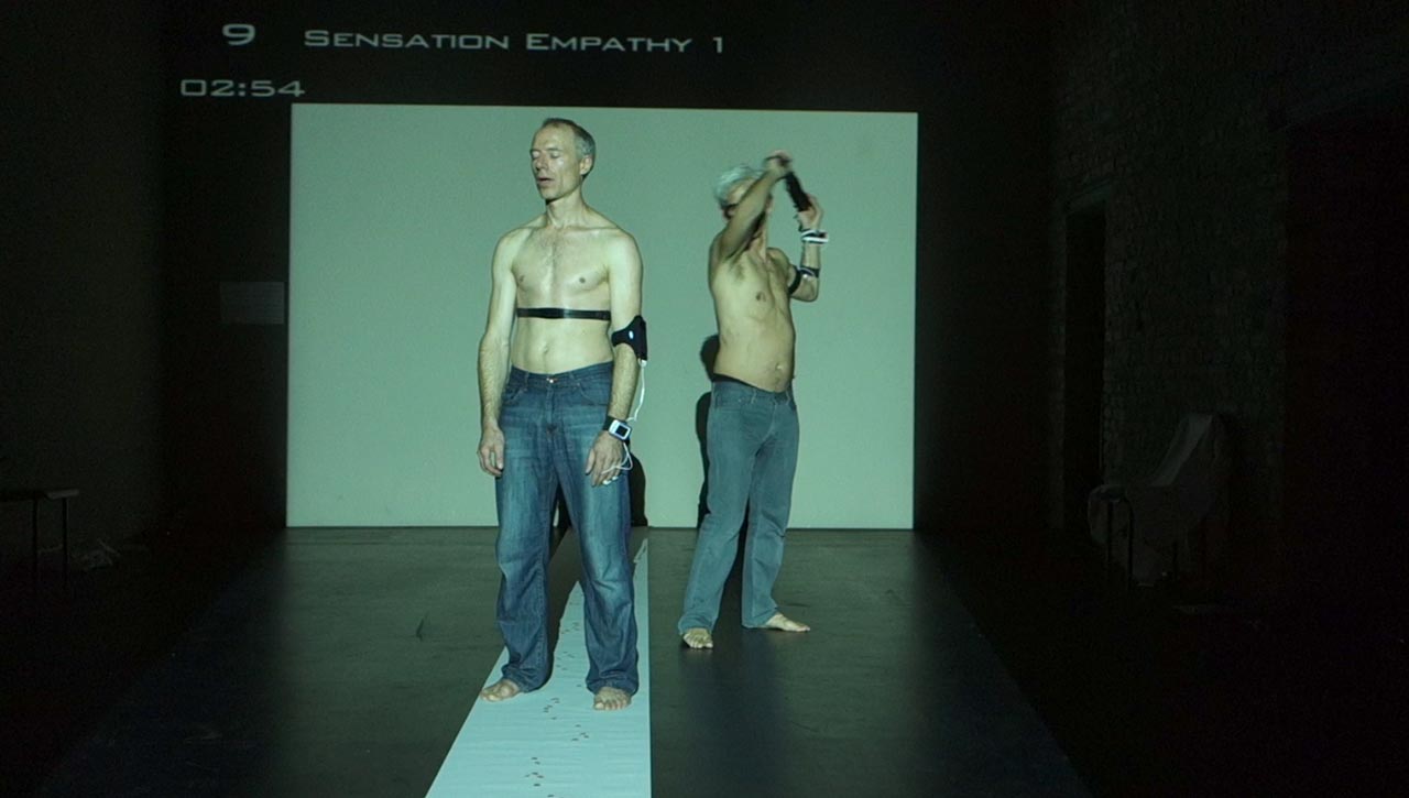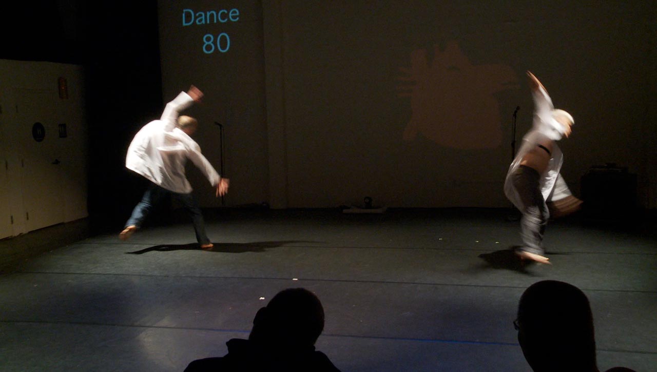 Performance Research Experiment #2.2 is a full-evening, interactive performance/experiment mixing contemporary dance, circus, performance art, live music and science. Creator/performers Jess Curtis and Jörg Müller along with French media artist Yoann Trellu, examine the relationships of live art and science to the body and culture. The evening is constructed of 17 performance actions that are presented while measuring and projecting data from specific physical reactions (heart rates and skin conductivity) of selected audience members into the performance.