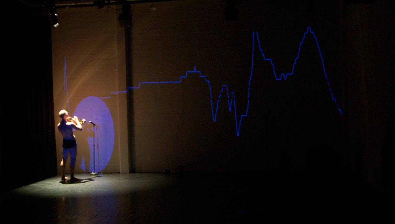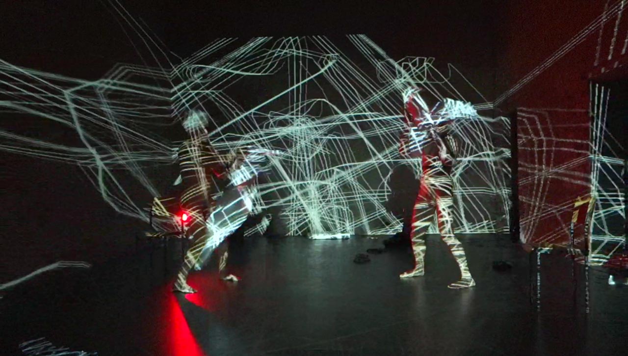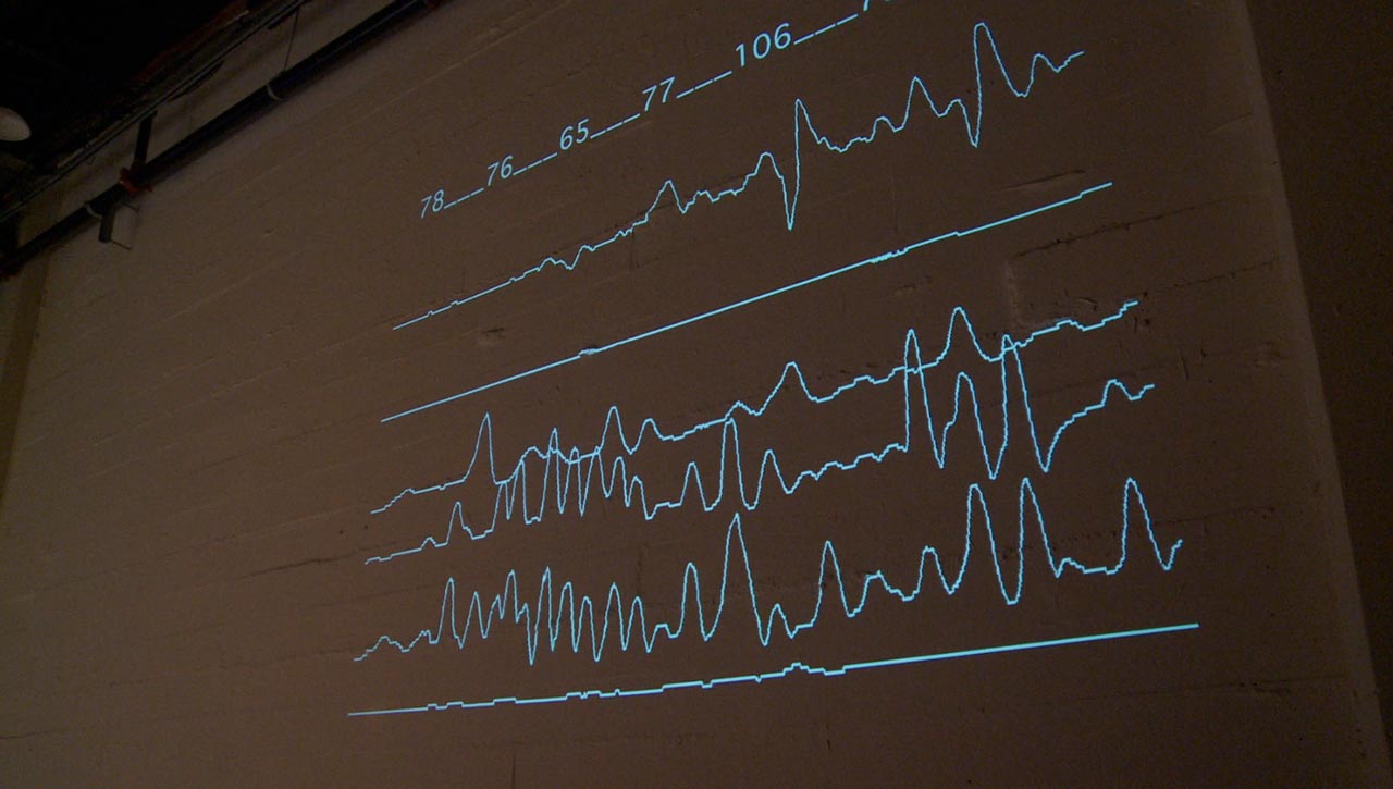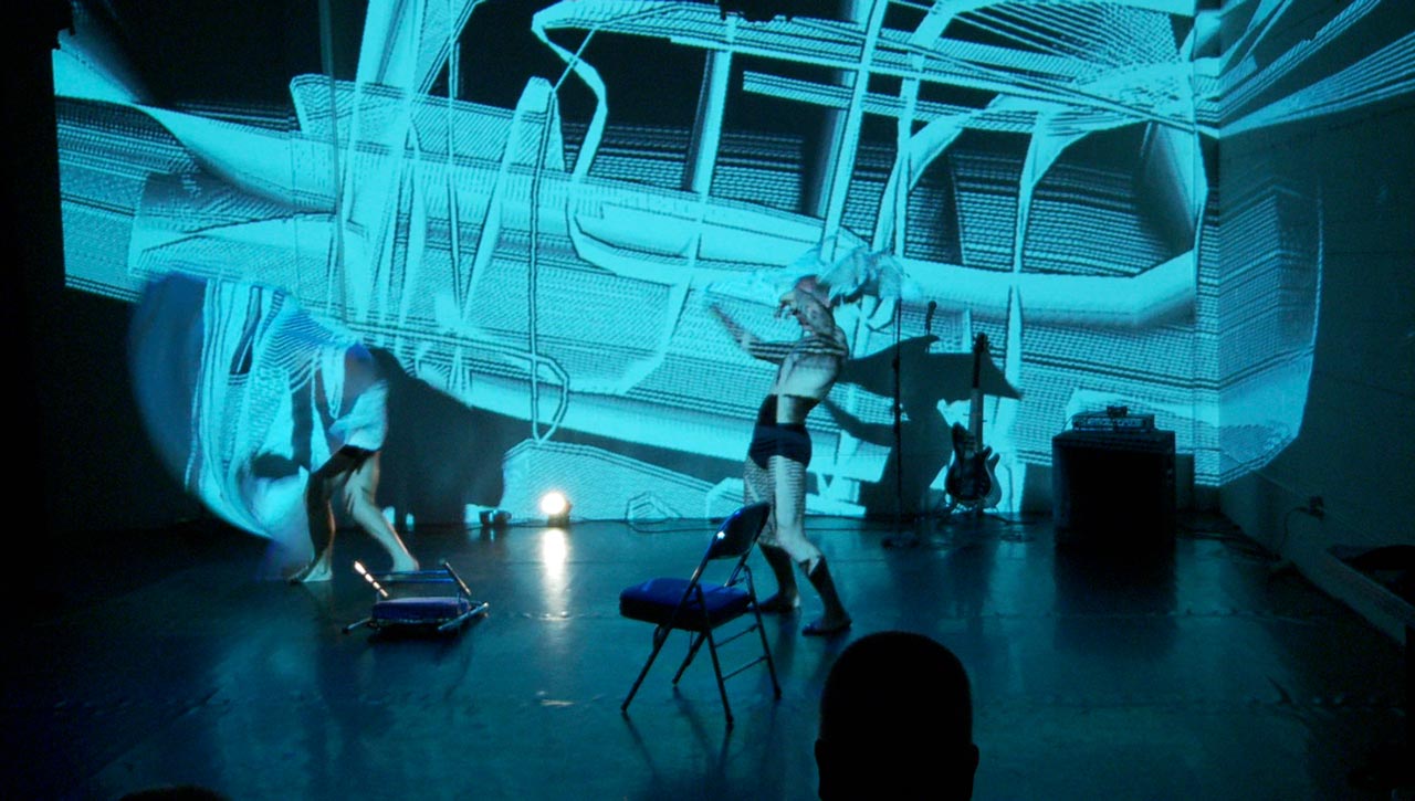 Performance Research Experiment #2.2 is a full-evening, interactive performance/experiment mixing contemporary dance, circus, performance art, live music and science. Creator/performers Jess Curtis and Jörg Müller along with French media artist Yoann Trellu, examine the relationships of live art and science to the body and culture. The evening is constructed of 17 performance actions that are presented while measuring and projecting data from specific physical reactions (heart rates and skin conductivity) of selected audience members into the performance.