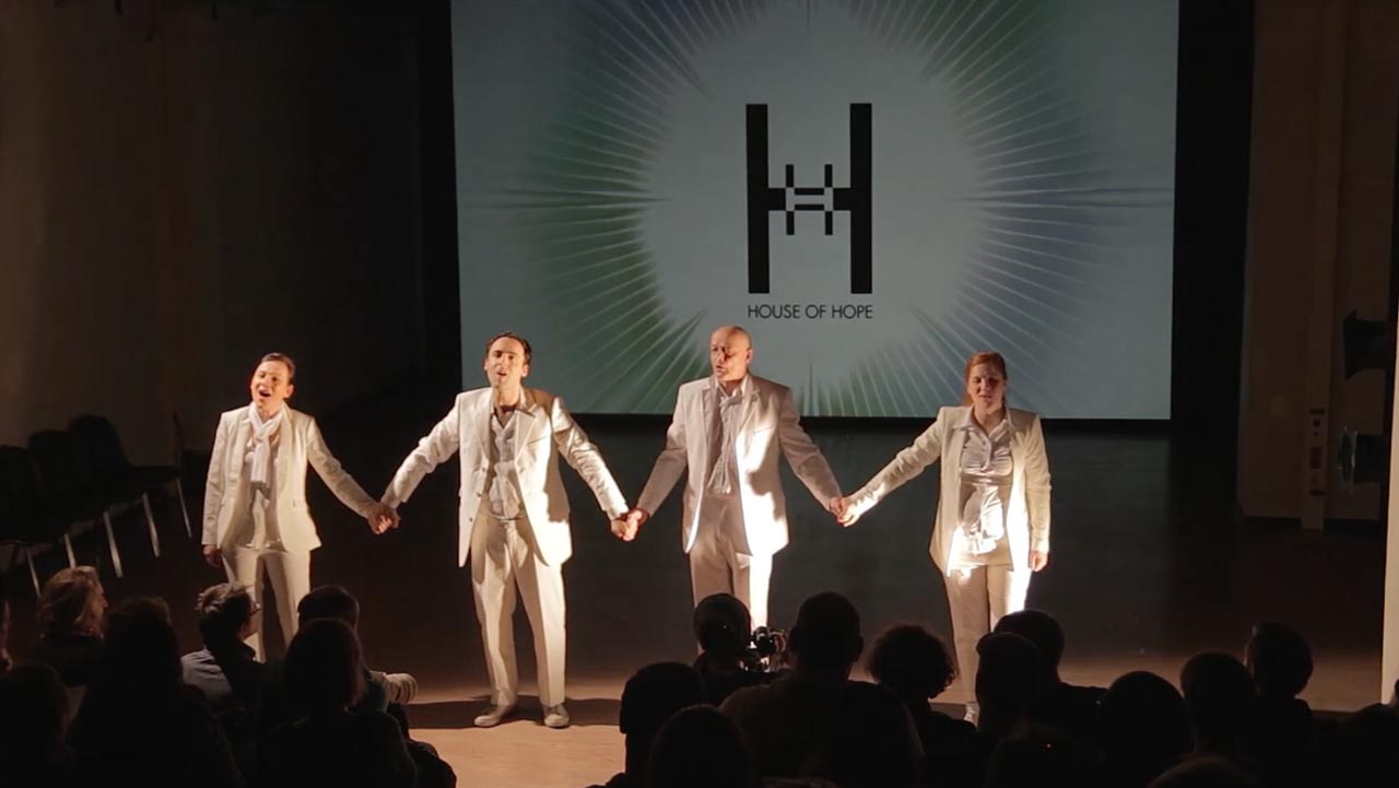 A theater performance about residing, residents and residences between nightmare and vision Everybody resides somewhere, but for more and more people it becomes difficult to find an appropriate place of dwelling. In most cities around the world the increase in prices for rental housing or apartments for sale is a number one topic in both media and on the streets. Many people are forced to move into less attractive neighborhoods due to the gentrification of down-town areas. Or they are compromising the space of their place - and their comfort. House of Hope starts a new movement against the crisis of housing.